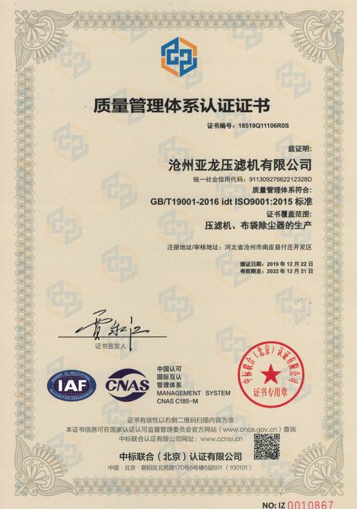 質量管理體系認證證書-滄州亞龍壓濾機有限公司