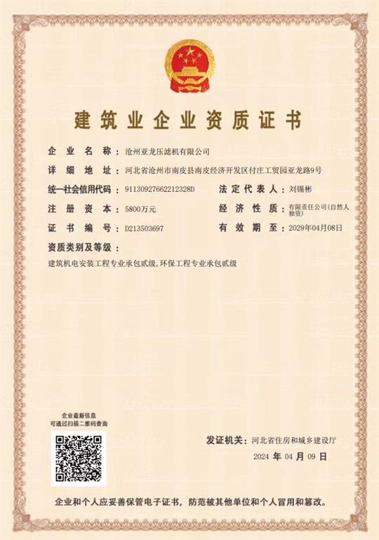 建筑業(yè)企業(yè)資質(zhì)證書-滄州亞龍壓濾機(jī)有限公司